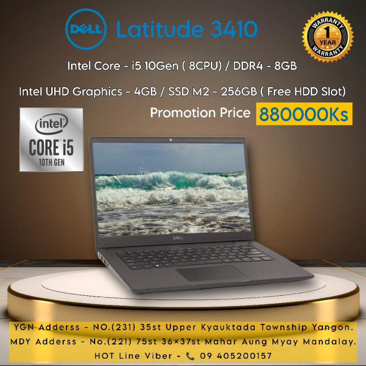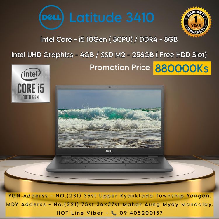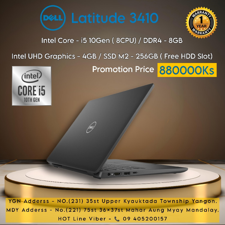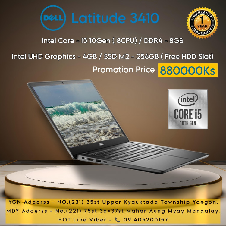 📞09405200157 , 09987299996Screen Size - 14"💻 Dell Latitude 3410✖ Normal Price -950000Ks✖(Cashback 70000Ks)✅ ⚡Special Offer - #880000Ks✅✅ Intel Core i5-10th Gen ✅ 10th Generations✅ RAM_8 GB DDR4✅ Intel Graphics UHD 8GB✅ Screen Size 14”✅#SSD_M2_256GB✅ WiFi , HD Webcams / Bluetooth ✅ Card Reader , Lan, HDMI , ✅ Officials 1 Year Warranty✅ Lifetime Service Warranty✅ Free software installation✅ Window 10 Pro 64Bit⚡️☎Hot Line or Viber 09405200157