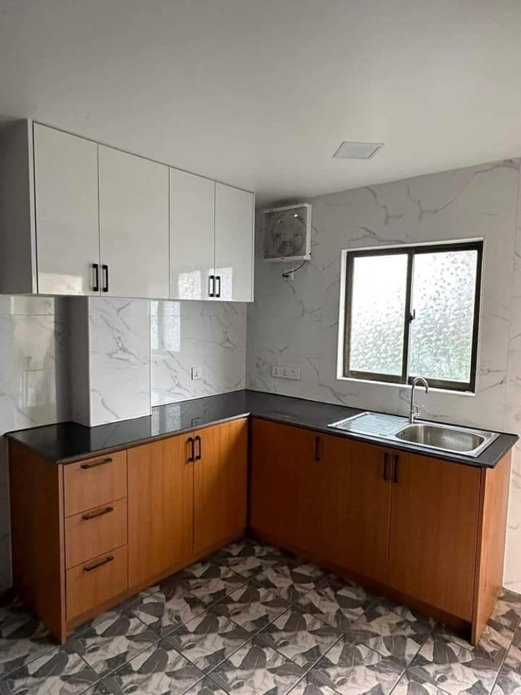 မီးဖိုခန်းကြမ်းခင်း+နံရံကြွေပြားအပြည့်ကပ်ထားပြီး မီးဖိုခုံ အပေါ်/အောက် Cabinet များပါကာ